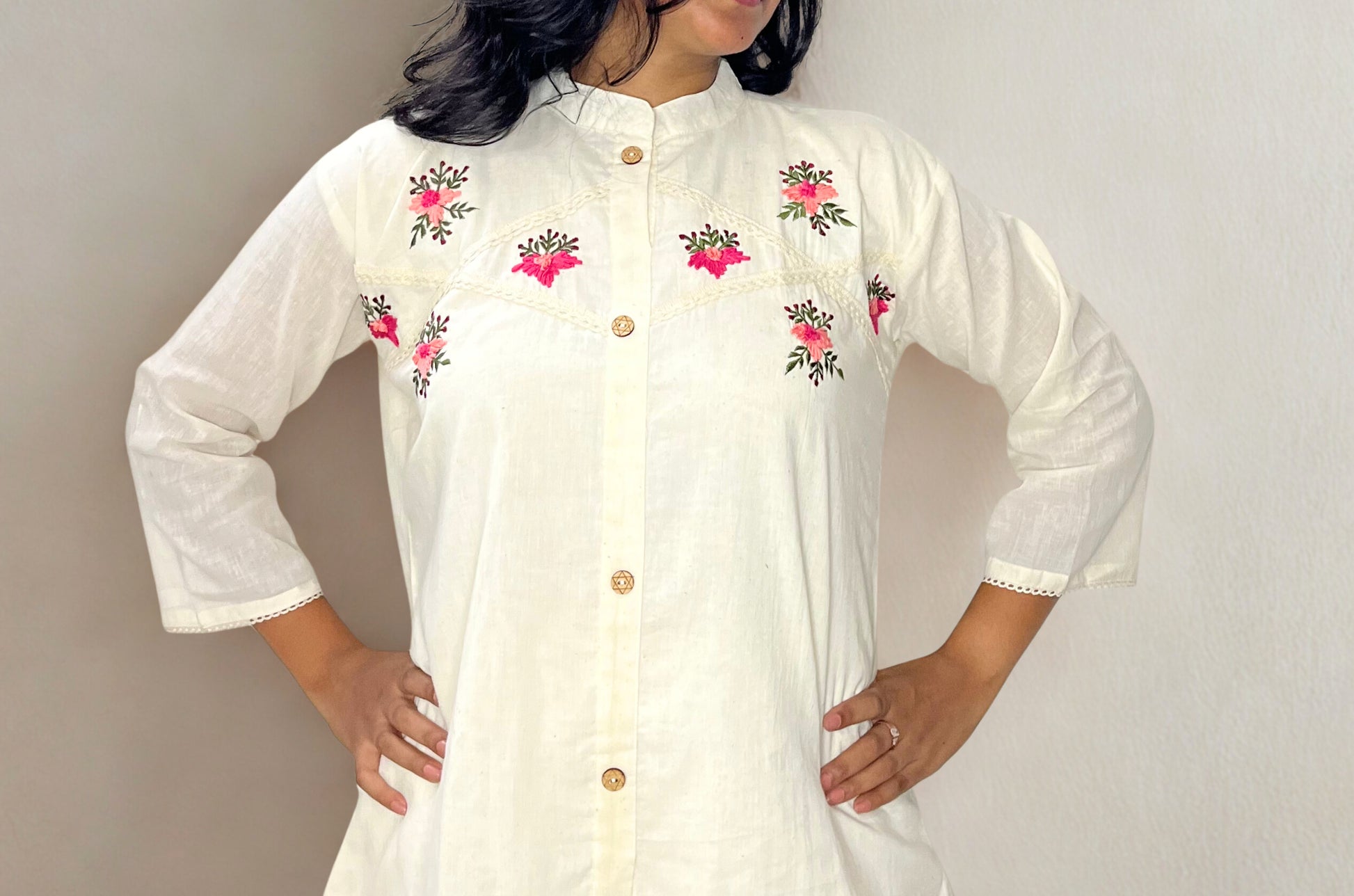 Exude timeless grace with this off-white top crafted from unprocessed pure khadi. Adorned with delicate pink and green floral embroidery, it combines artisanal detailing with a naturally elegant texture. The wooden buttons, mandarin collar, and relaxed silhouette make it a perfect blend of comfort and sophistication.