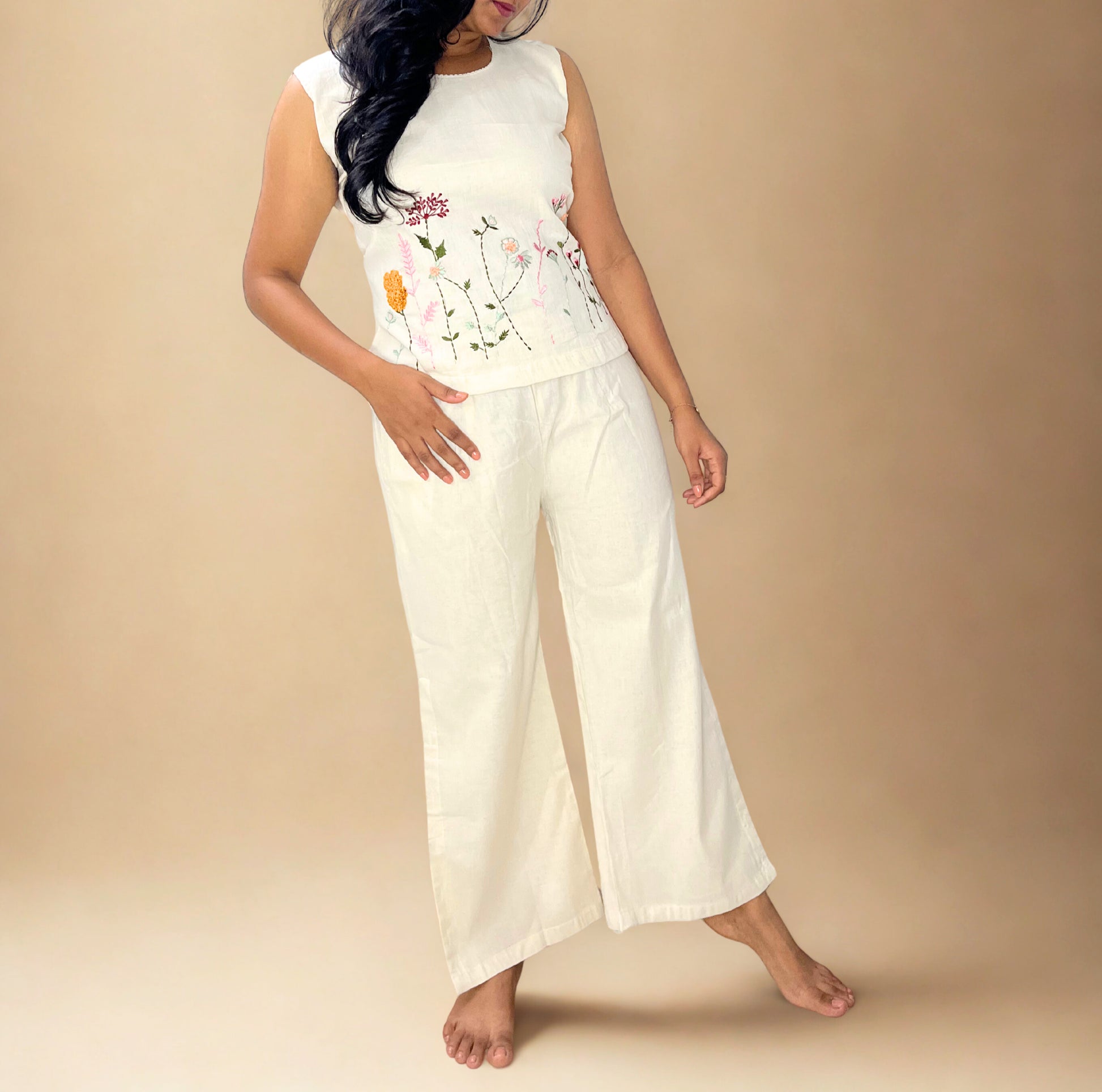 Elevate your everyday elegance with this off-white co-ord set crafted from unprocessed pure khadi. The top features charming multicolor floral embroidery, paired with wide-leg pants that include functional pockets and side brown button detailing. Designed for refined comfort, it also comes with optional short sleeves for a versatile, graceful look.
