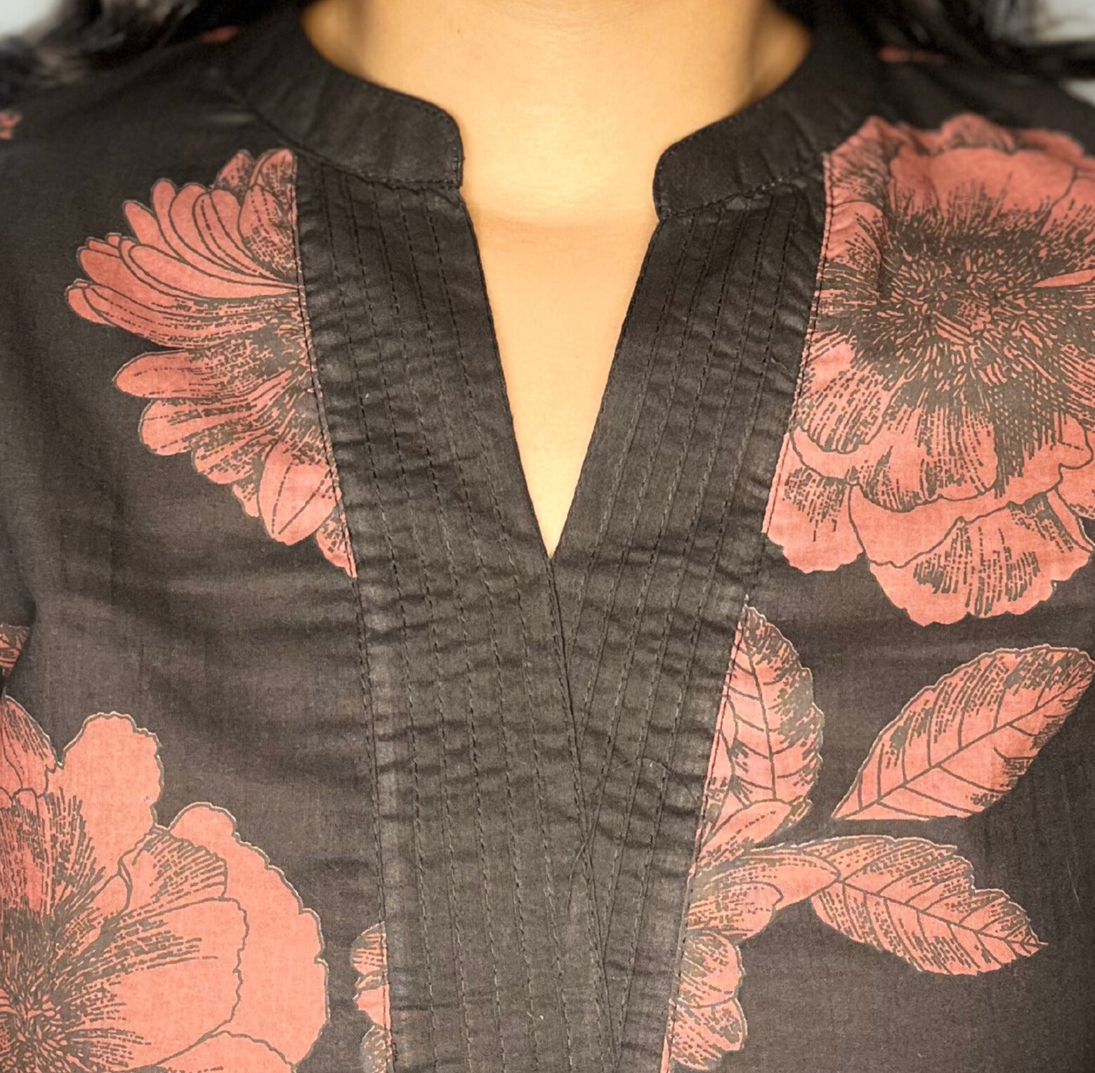 Exude effortless sophistication with this black kurti and pant set crafted from pure cotton. Featuring striking rust floral prints, a structured neckline, and two functional side pockets, this set blends comfort with refined elegance. The straight fit and breathable fabric make it ideal for both workwear and casual outings