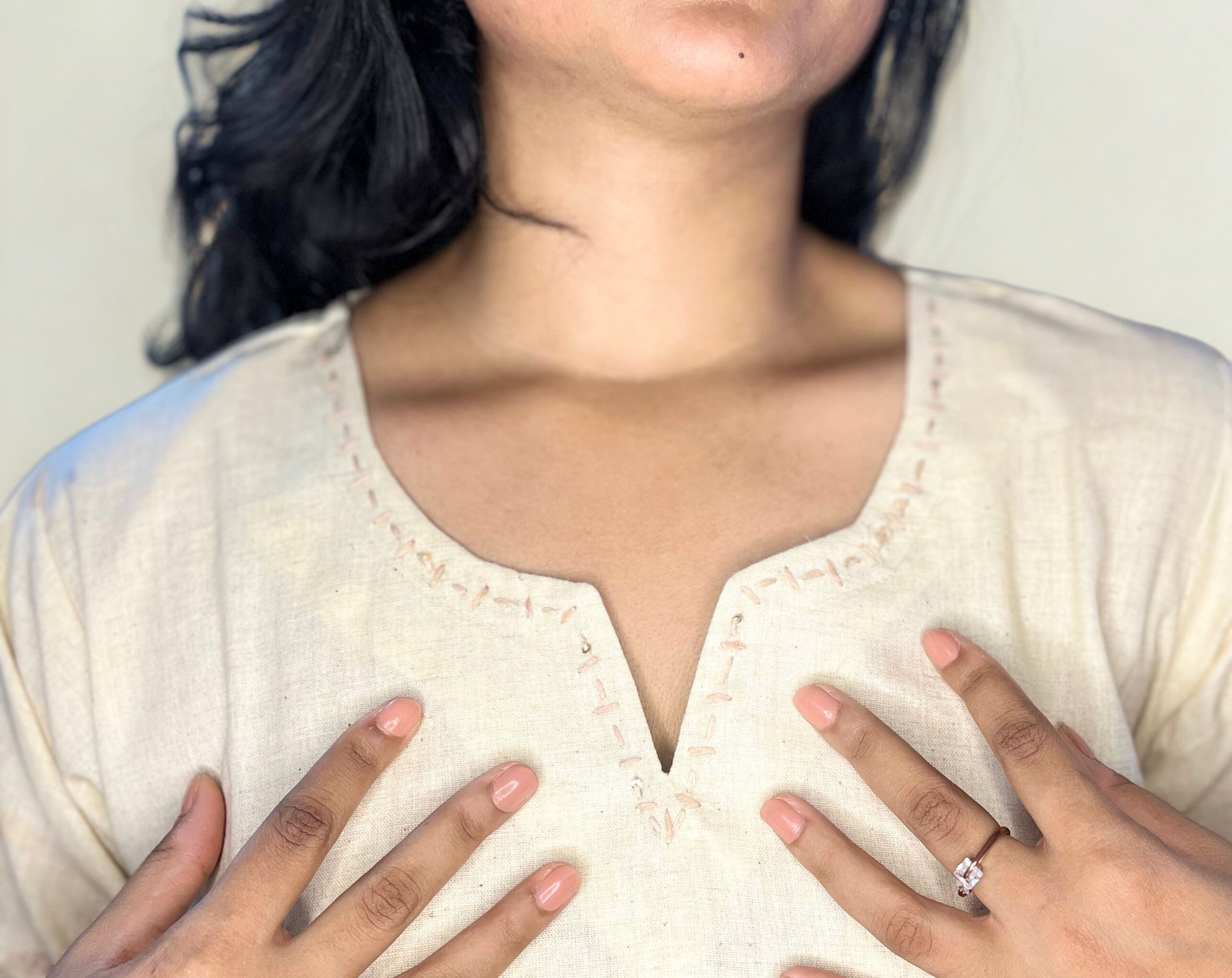 Details: V-neckline with stitch accents, 3/4th sleeves, leaf applique with French knot embroidery, matching straight cotton pants